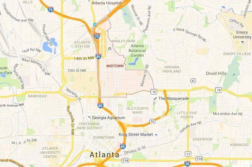 Midtown is located just north of Downtown Atlanta and south of Buckhead, fully inside the I-285 perimeter.